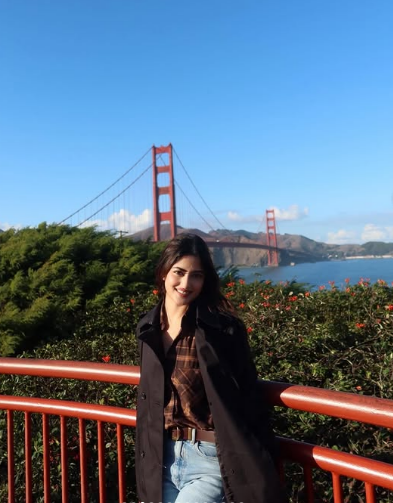 The actor’s first photo sets the tone: Sajal stands near the Golden Gate Bridge, styled in an effortlessly chic plaid shirt topped with a black trench coat. The warm California light highlights her features, turning a casual travel shot into something cinematic. Her calm expression paired with the city’s iconic backdrop creates a sense of quiet elegance that instantly pulls viewers in.