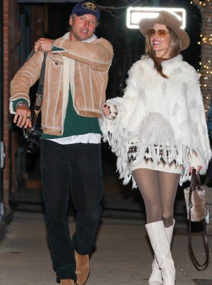 For the festive evening, Alessandra embraced a chic winter look, donning a white knit poncho paired with matching leather boots and a brown hat. Buck complemented her effortlessly stylish ensemble in a tan shearling jacket layered over a green sweater, black pants, and a blue baseball cap. The pair’s coordinated cold-weather fashion perfectly suited the scenic Aspen setting.