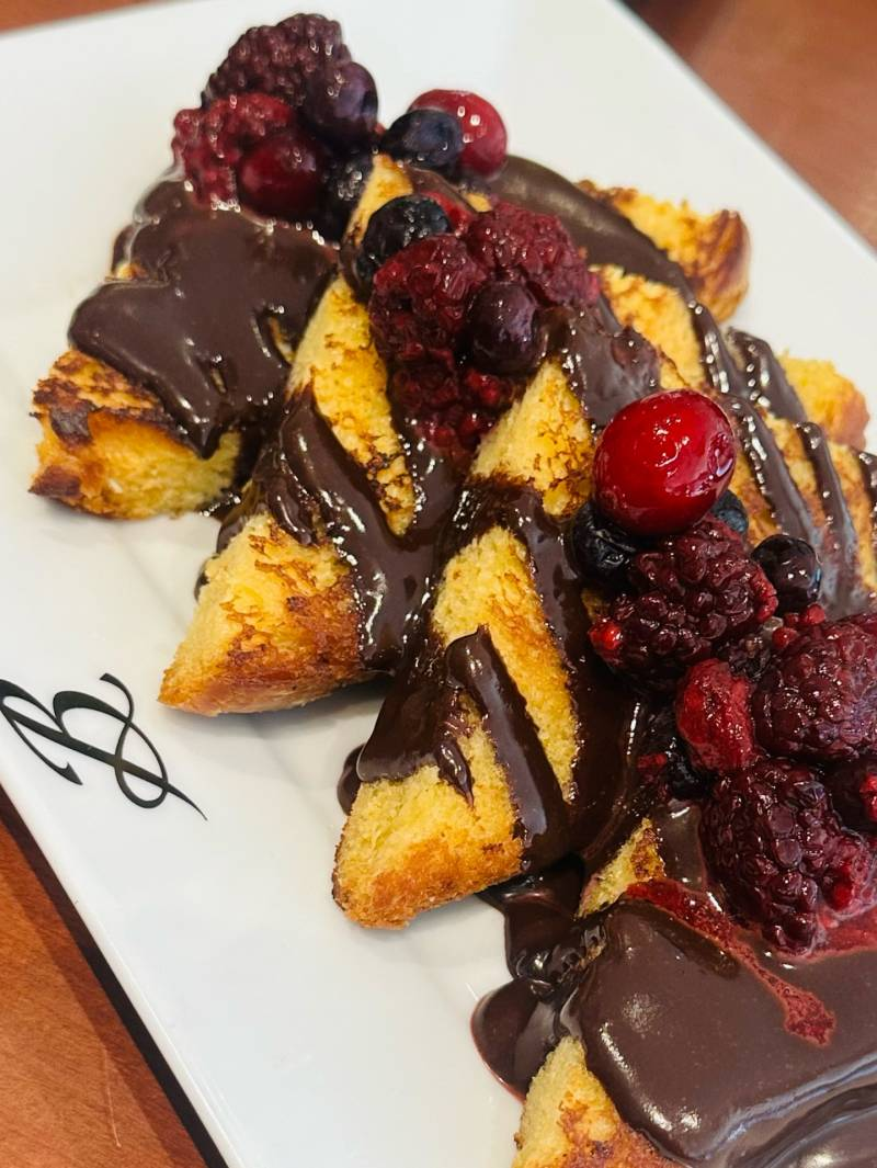 The first and third images highlight Alizeh in close-up mirror selfies, complemented by a plush panda accessory, creating a lighthearted and whimsical vibe. The middle slide captures a plate of French toast garnished with chocolate syrup, raspberries, and blueberries, giving fans a peek into her casual breakfast or snack moment.