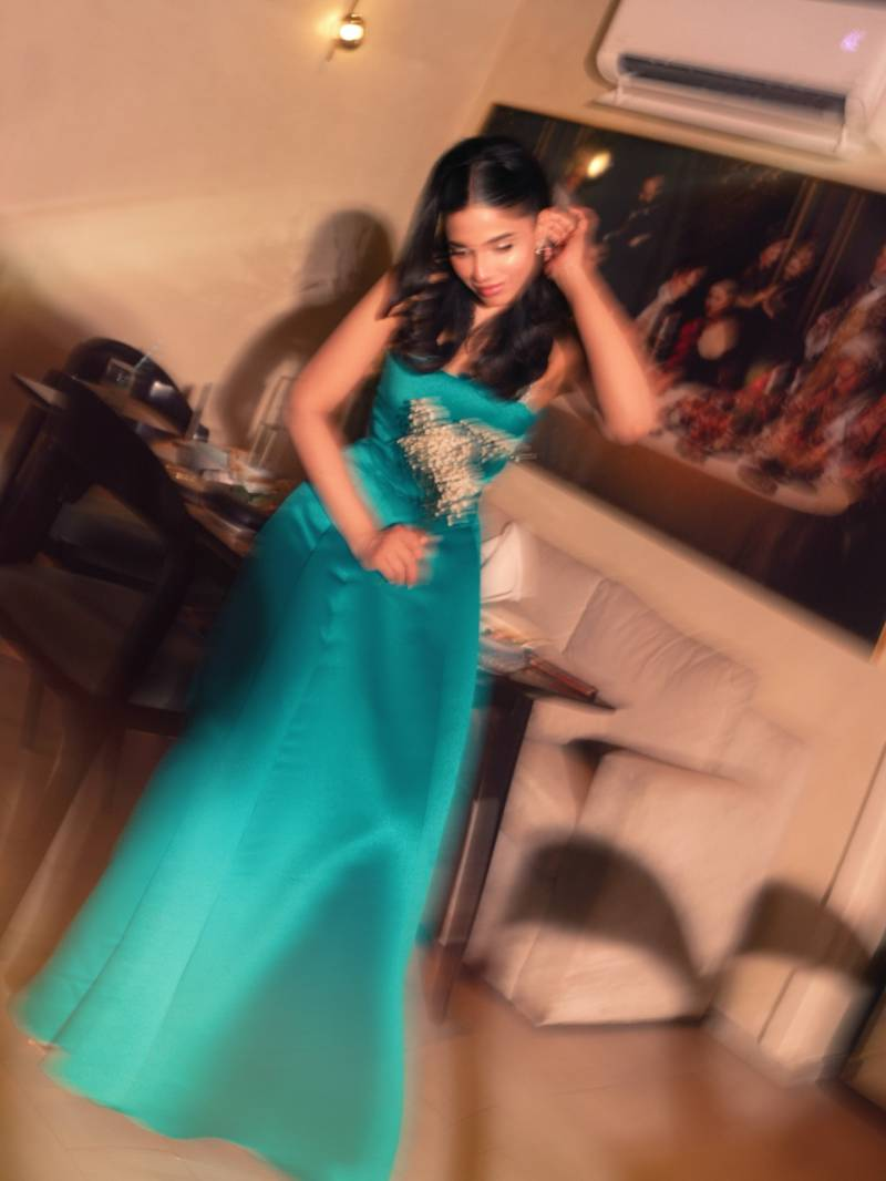 Dressed in a rich emerald satin gown featuring a structured bodice and sparkling halter straps, Sonya exuded sophistication. The voluminous silhouette paired with a crystal-embellished clutch and silver glitter heels created a regal yet modern aesthetic. Sleek side-parted waves, soft dewy makeup, and a subtle script tattoo on her forearm added an individualistic, old Hollywood touch to the ensemble.