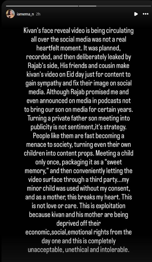 In a strongly worded Instagram story, Emaan Rajab claimed that the viral footage showing Rajab Butt meeting his son for the first time was not an emotional, spontaneous moment, but rather a “planned, recorded, and deliberately leaked” clip intended for publicity. She alleged that the video was circulated by individuals from his circle to generate sympathy and improve public perception.